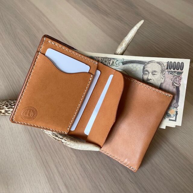 とてもコンパクトに収まり、スーツのポケットやカバンのポケットにすっぽりと収まるサイズ感です。小銭入れはマチがありませんが、ガバッと開くような構造で、比較的出しやすくしています。フラップにボタンは付けていませんが、革に癖づけをしてますので、小銭が落ちるような心配はありません。薄くするため、あえて小銭はあまり持ち歩かず、スマートさを残しています。お札は、片側を縫わないことにより、入れやすいです。