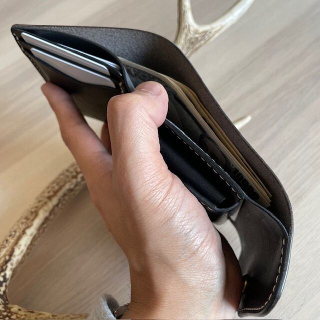 ●ポイント:小銭入れを立体的に仕上げているため大容量。お札もちょうど収まるサイズです。カード入れは2枚ずつ入れるイメージです。